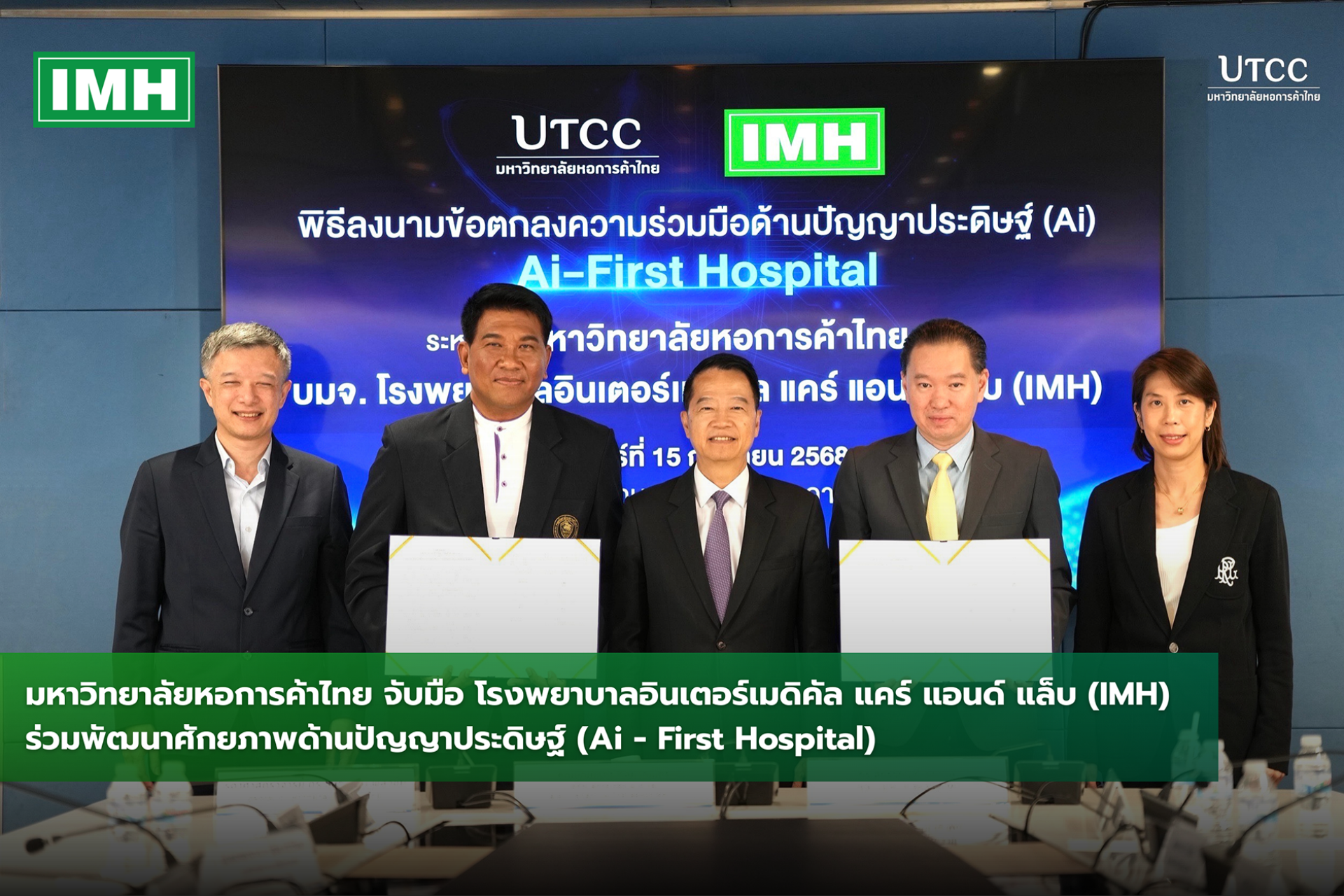 The University of the Thai Chamber of Commerce (UTCC), through its Information Technology Division, hosted a signing ceremony for a Memorandum of Understanding (MoU) between UTCC and Intermedical Care and Lab Hospital Public Company Limited (IMH). The collaboration aims to enhance artificial intelligence (AI) capabilities to upgrade hospital management systems and transform IMH into an AI-First Hospital.