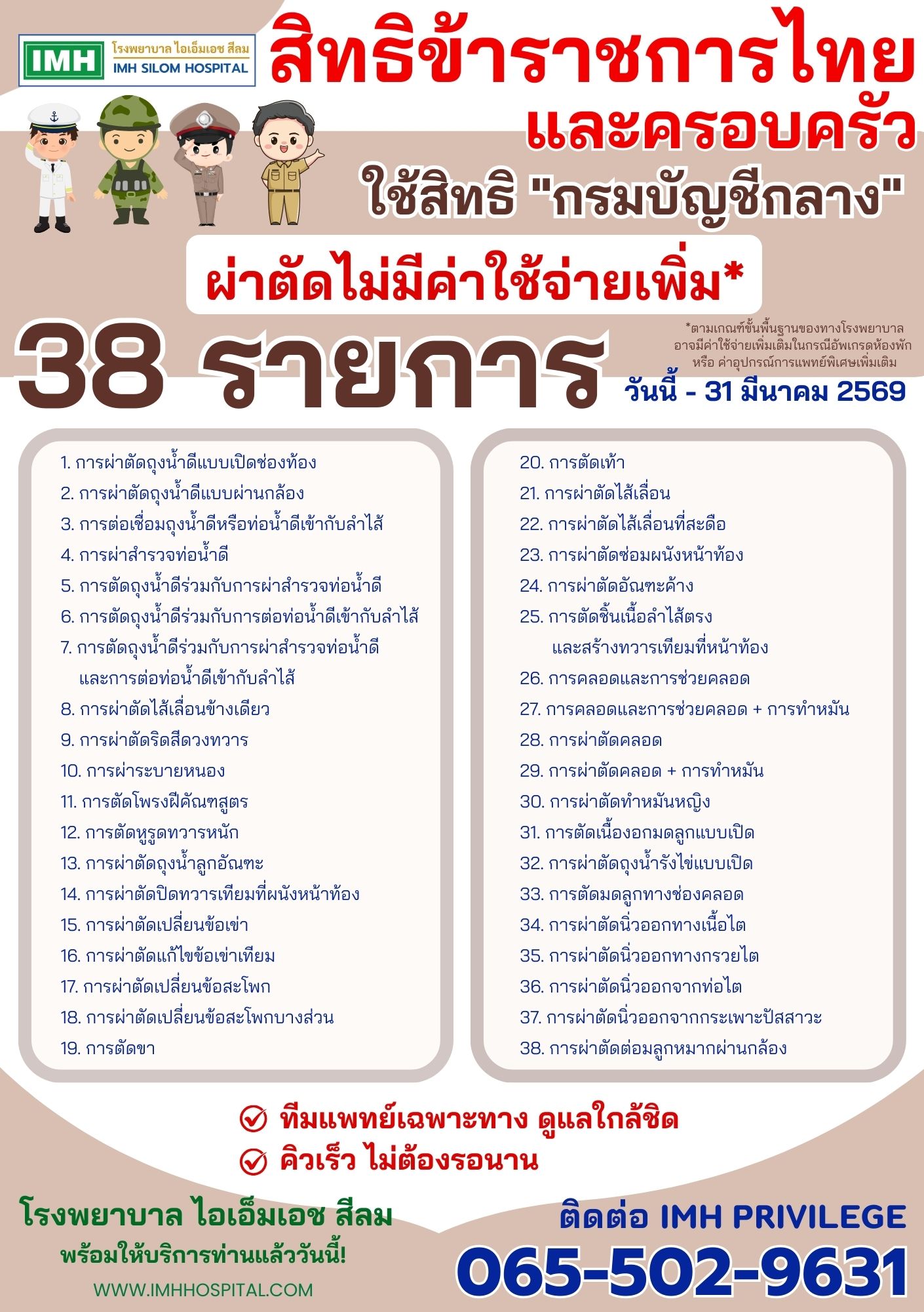 สิทธิข้าราชการไทยและครอบครัว ใช้สิทธิ "กรมบัญชีกลาง" ผ่าตัดไม่เสียค่าใช้จ่าย ที่ โรงพยาบาล IMH สีลม ตั้งแต่วันนี้ - 31 มีนาคม 2569